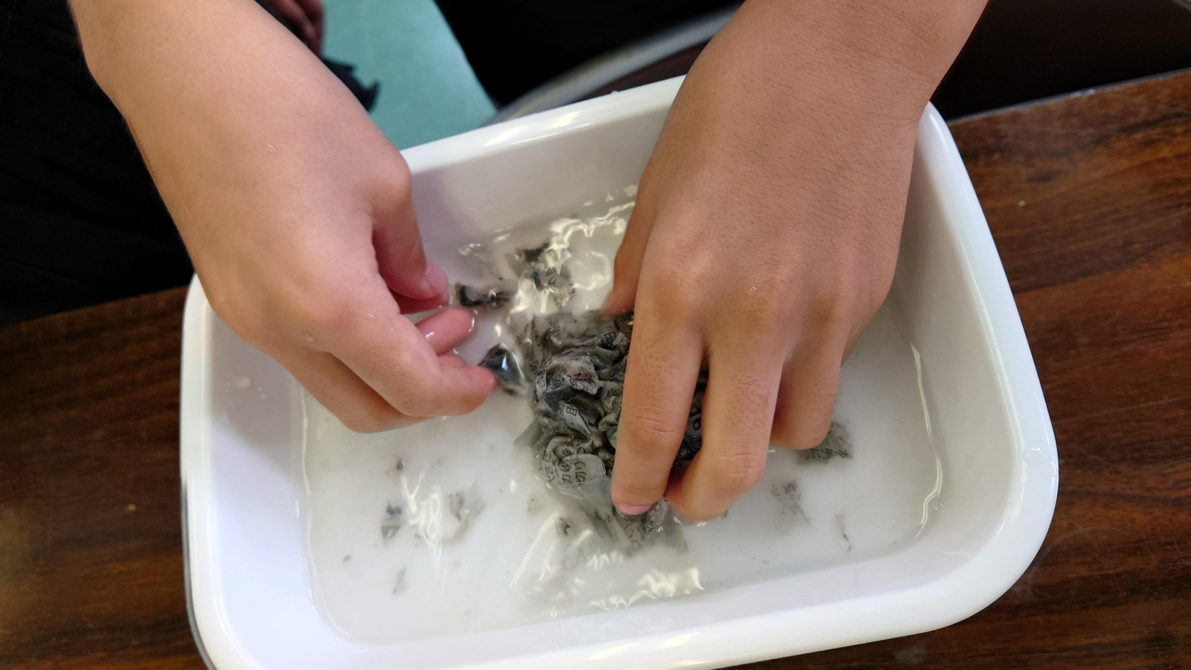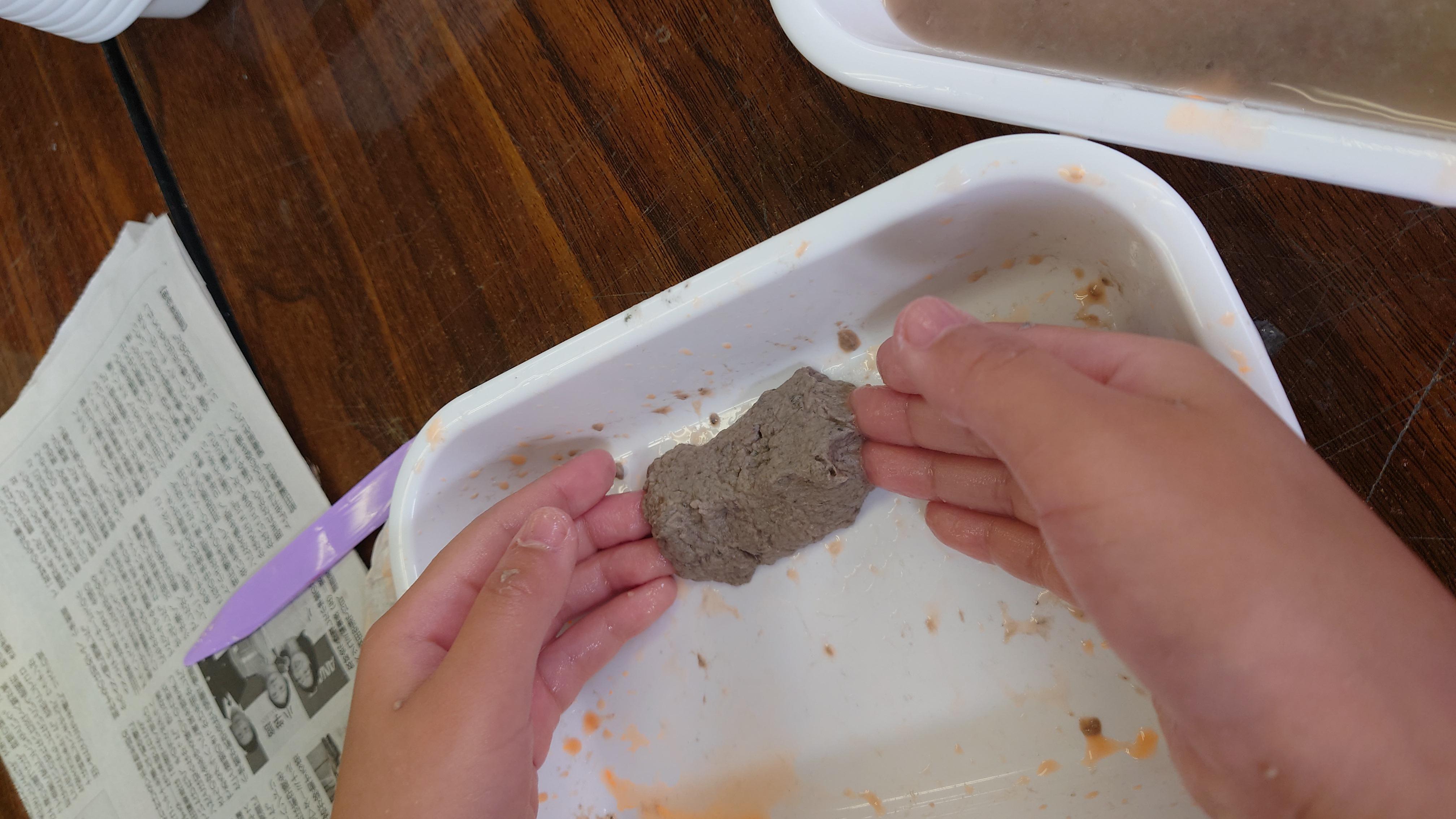 細かくちぎった新聞紙に水と今回は木工用ボンドを混ぜて、どろどろにしていきました☆
